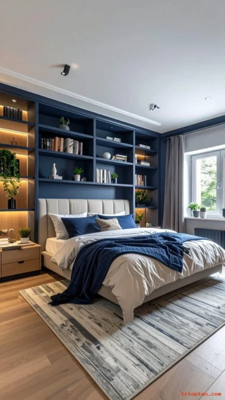 Match the shelf navy with a pillow or throw on the bed. Use warm lighting inside shelves if you can. Add a small basket on a lower shelf for hidden storage.