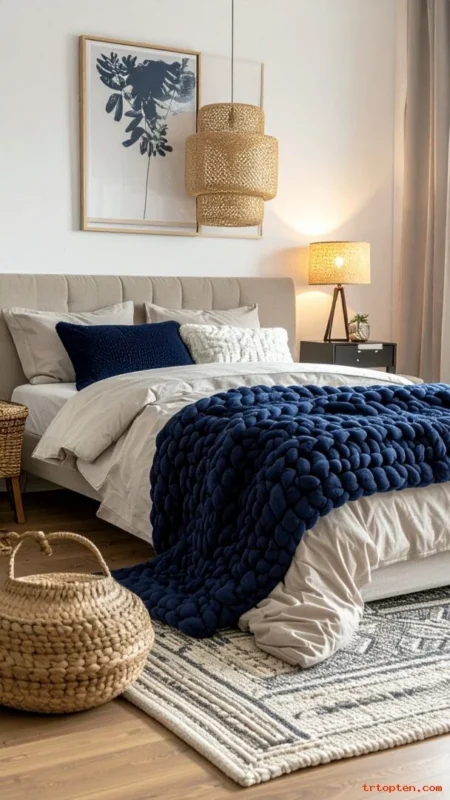 Drape a navy throw blanket across the bed. This adds color with zero paint and low cost. Choose a chunky knit or soft woven texture.