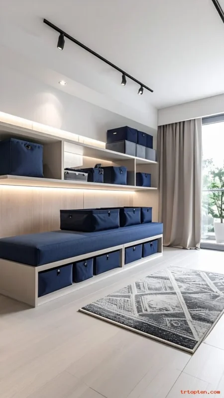 Use navy storage baskets or fabric bins for a neat look. This helps you hide clutter and keep the room calm. Place them on shelves, under a bench, or in a closet.