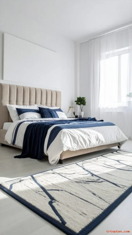 Navy Rug to Ground a Light Bedroom