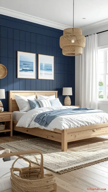 Install shiplap on one wall and paint it navy. This adds texture and a relaxed coastal feel. Pair it with white bedding for a clean contrast.