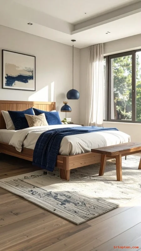 Add navy in the bedding, art, or one wall. Keep textiles in cream and beige to soften edges. Use a jute or wool rug for comfort.