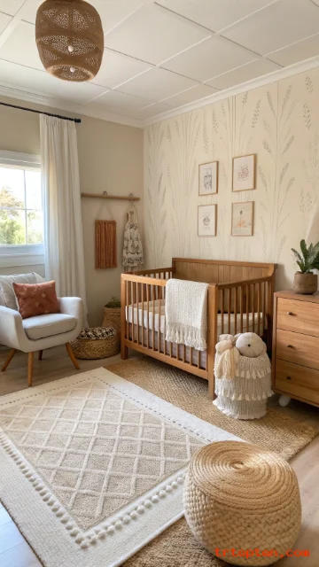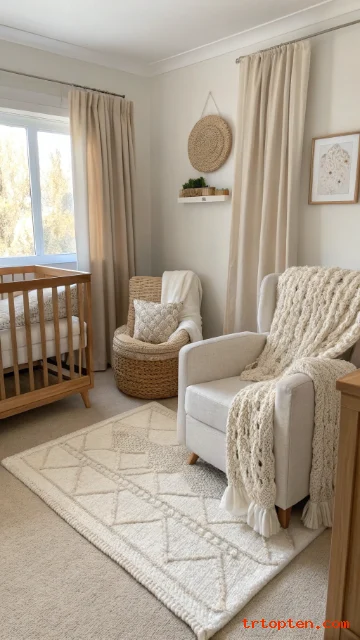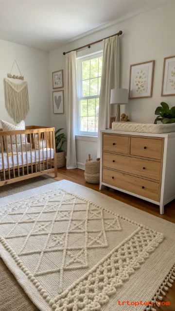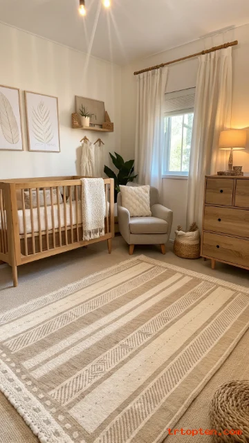A soft beige rug adds comfort underfoot during night wakes. Texture helps the rug stand out while staying neutral.