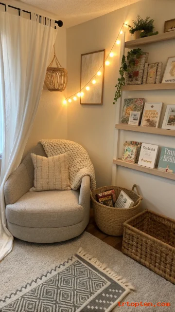 A reading corner supports bedtime routines and quiet bonding. Add a soft chair, a floor cushion, and a low book ledge.