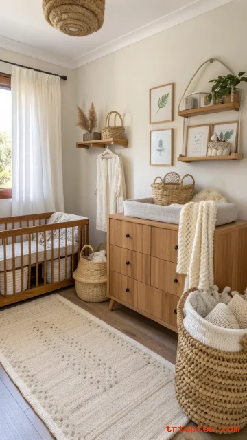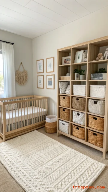 Natural fiber baskets look warm and hide baby gear fast. Use them for blankets, toys, and extra diaper packs.