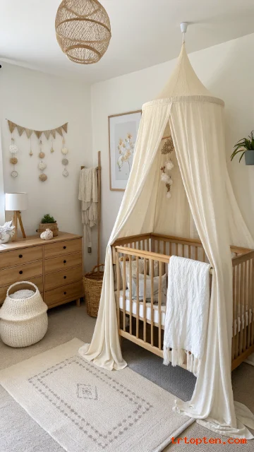 A canopy adds softness and a dreamy shape. Use a light fabric in cream or beige for an airy look.