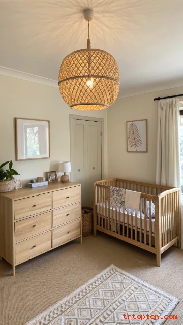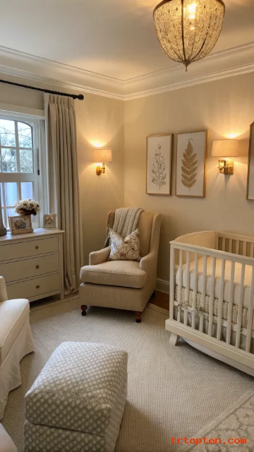 Warm lighting supports a soothing mood and helps with night feeds. Use warm bulbs, soft shades, and dimmable options when possible.