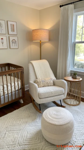 Place a small side table next to it for bottles and books. Add a soft floor lamp with warm light for nighttime comfort.