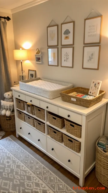 A compact changing station keeps routines easy in small rooms. Place a changing pad on a sturdy dresser and add a tray for essentials.
