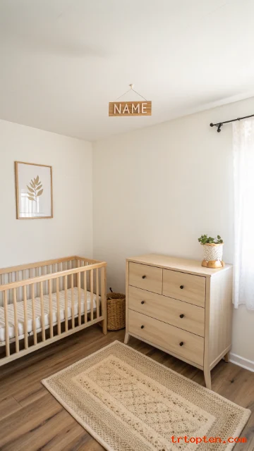 A simple name sign personalizes the room without bold color. Use wood, acrylic in beige, or stitched letters in neutral thread.