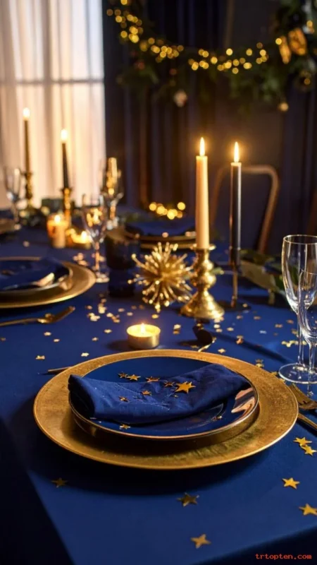 Use deep blue napkins with gold chargers for a rich midnight theme. Add star-shaped confetti for a night-sky look.