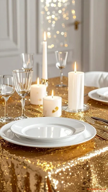 Use a gold sequin tablecloth for full glam impact. Pair it with plain white plates to keep it clean.