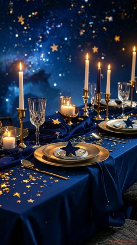 Use star napkin rings, star confetti, and star-shaped lights. This theme feels playful and perfect for New Year night.