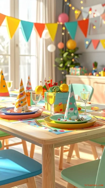 Use bold colors, shatterproof cups, and fun party hats at each seat. Keep the decor simple and safe.