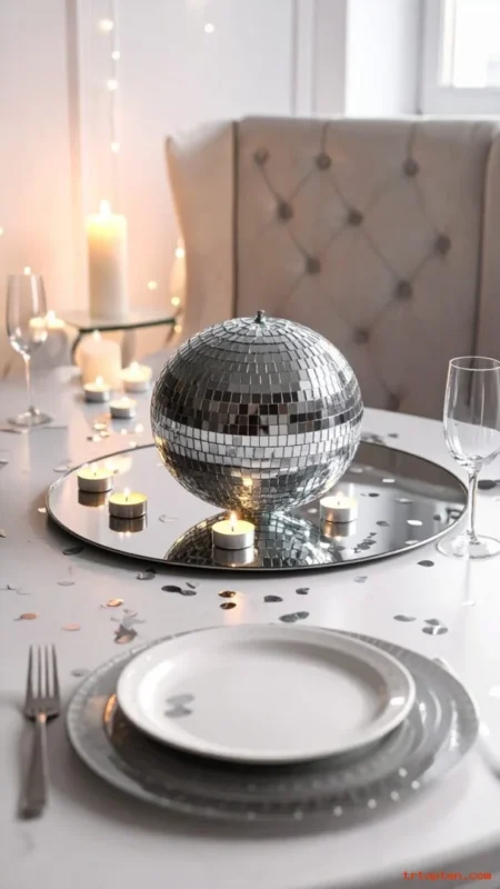 Use one or three disco balls as the centerpiece for a bold party feel. Pair them with silver confetti and mirror trays.