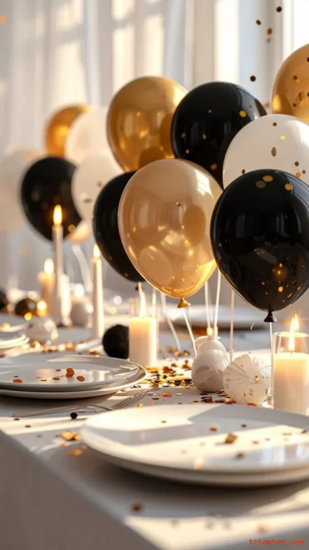Use mini balloons in black, gold, and white as part of the centerpiece. Add confetti in matching colors to tie it together.