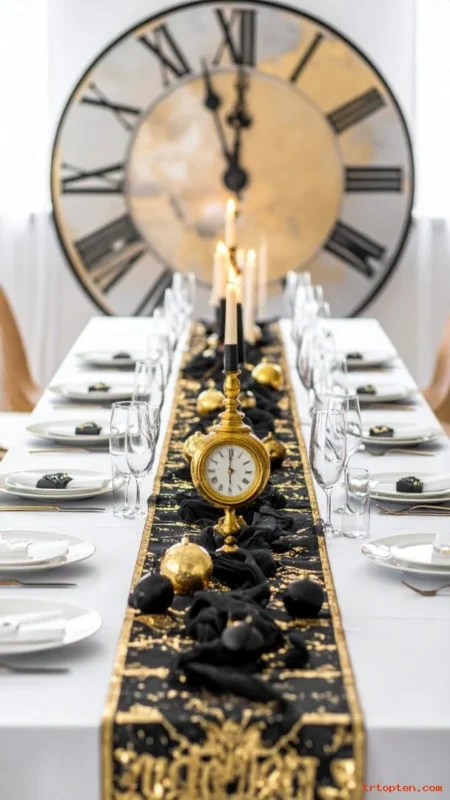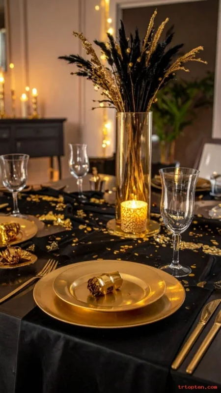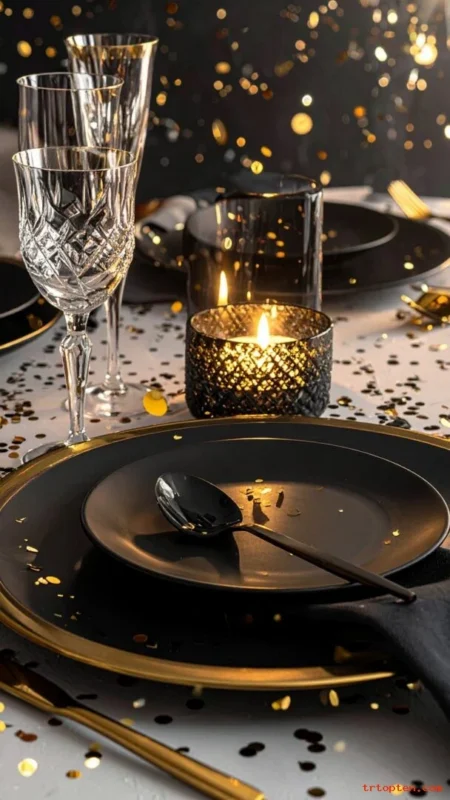 Use a black table runner and gold chargers for a classic party look. Add gold confetti to bring instant New Year energy.