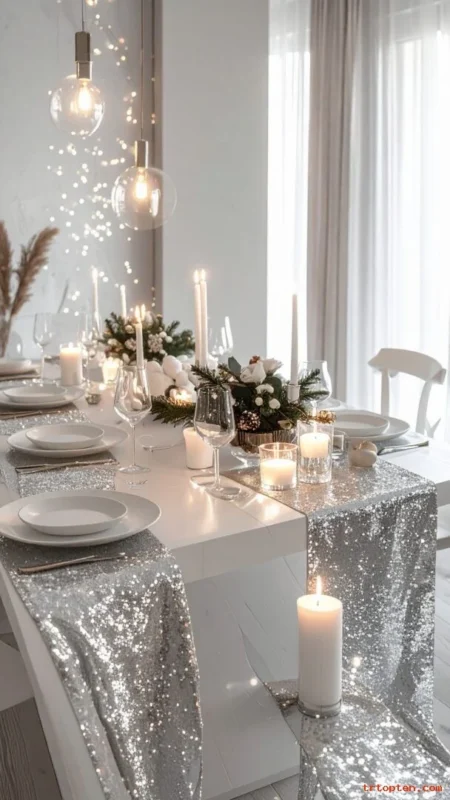 Use a white tablecloth and silver accents for a clean, bright look. Add silver garland down the center for shine.