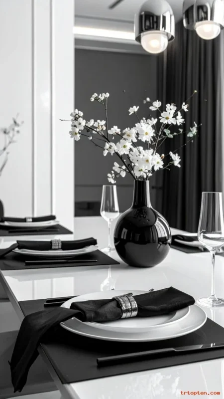 Choose a simple centerpiece like a black vase with white flowers. Use white candles in black holders for contrast.
