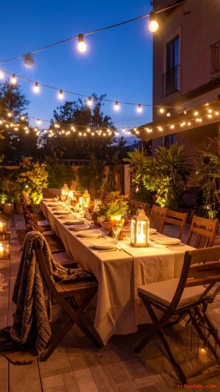 Use lanterns and string lights for an outdoor celebration table. Add warm blankets on chair backs for comfort.