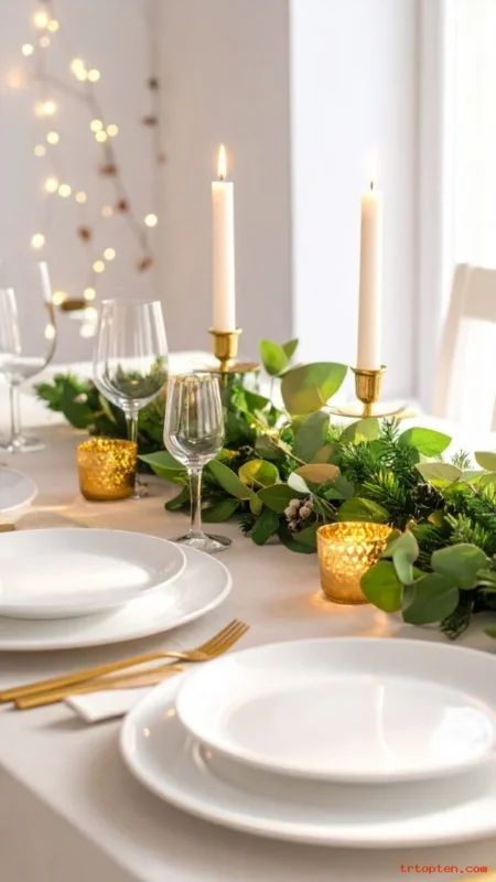 Use eucalyptus or pine greenery down the center for a fresh look. Add gold votives to bring a party shine.