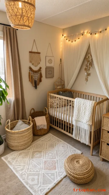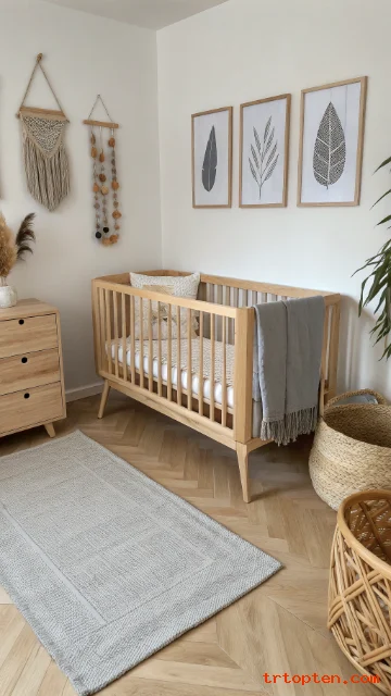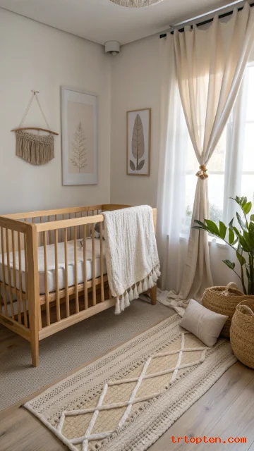 Use a woven basket for blankets and toys. Add a small macramé wall piece away from the crib. Choose muted earth tones for a calm mood.