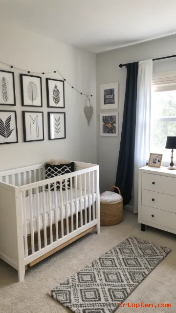 Pick a white crib with black hardware or trim. Add a high-contrast wall print across the room, not above the crib. Keep bedding soft and simple.
