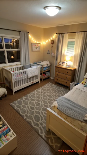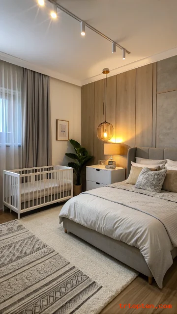 A ceiling track curtain can separate baby space from your bed. This helps light control during naps. It also creates a cozy feel without building walls.