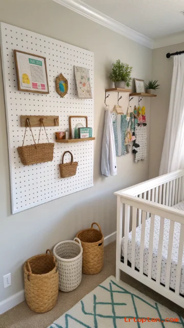 A pegboard stores small items in vertical space. You can hang tiny baskets and hooks. This makes late-night supply grabs faster.