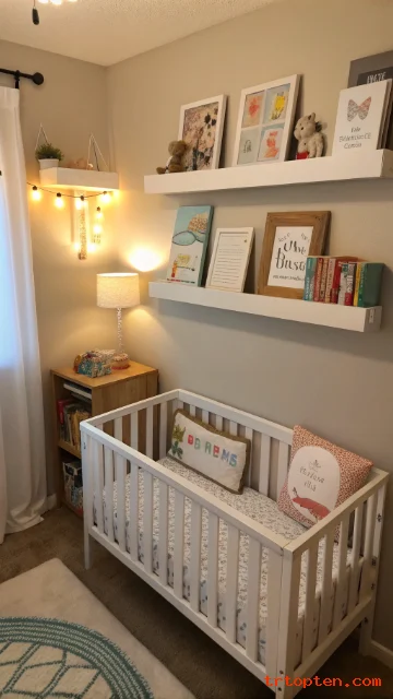 Mount the shelf high enough to avoid reach from the crib area. Use a short lip shelf so items do not slide. Keep decor light and simple to reduce visual clutter.