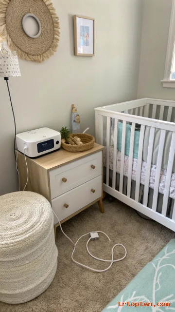 Place the sound machine on a shelf across from the crib. Keep volume at a safe level and not too close. Use a cable box to hide extra cords.