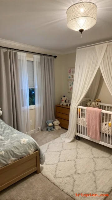 A canopy can make the corner feel special and calm. It adds softness and frames the sleep space. Keep safety as the top rule.