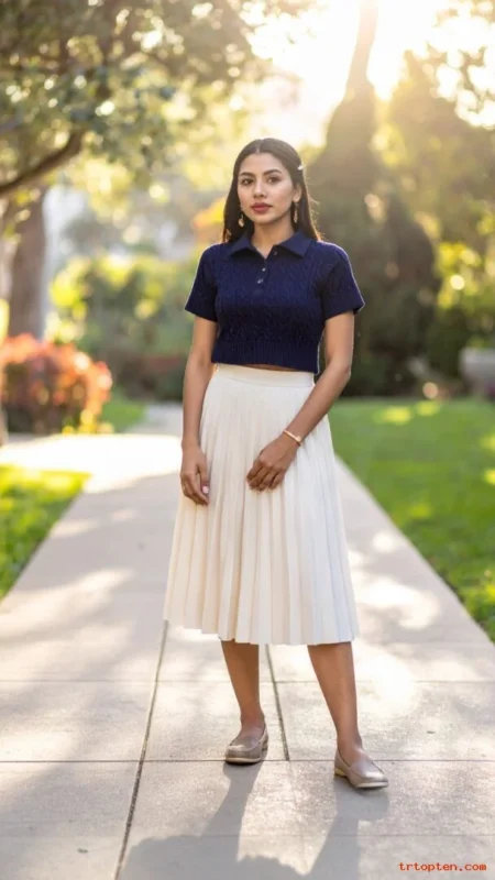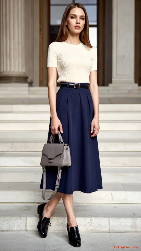 A cream blouse looks soft and refined against navy. A navy midi skirt adds structure and a timeless shape.Choose a blouse with a simple collar or a clean neckline. Pick a skirt with a smooth waistline and a gentle A-line.
