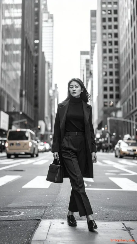 A black turtleneck gives a sleek base that always looks refined. Tailored ankle pants keep the outfit sharp and modern.