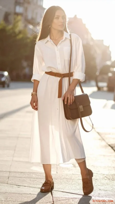 A white shirt dress looks crisp and timeless. A leather belt adds structure and gives the outfit a tailored feel.