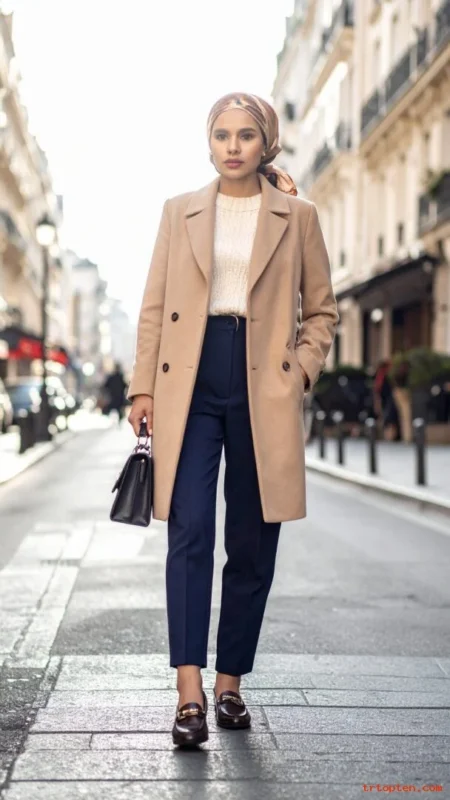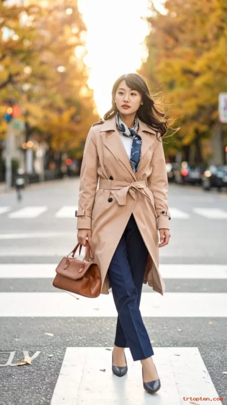 Wear tailored pants in beige, black, or navy to keep the shape crisp. Pick a trench with a clean collar and a belt that ties neatly.