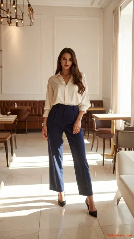 Choose ivory, champagne, or soft blue silk for a refined look. Pick pants in navy or black for contrast and structure.