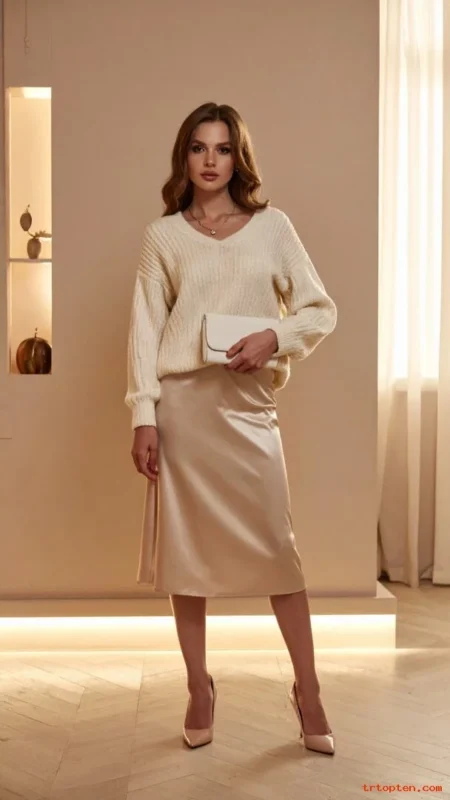 A satin slip skirt adds shine in a soft, tasteful way. A fine knit sweater balances it with a calm, classic texture.