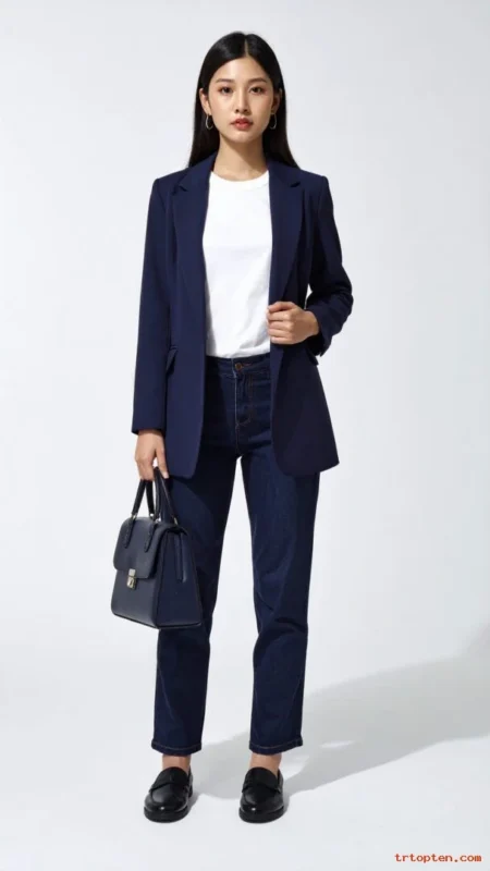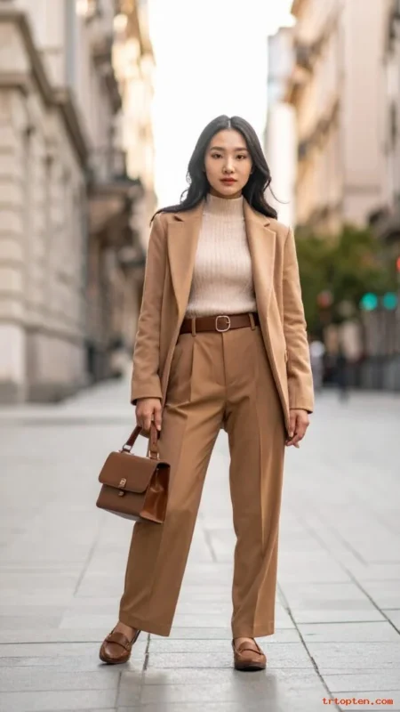 Choose straight or slim dark jeans with a structured waistband. Pick a camel blazer with clean lapels and a tailored waist.Add a white button-down or a simple knit top under it. Finish with loafers and a leather bag for a crisp look.