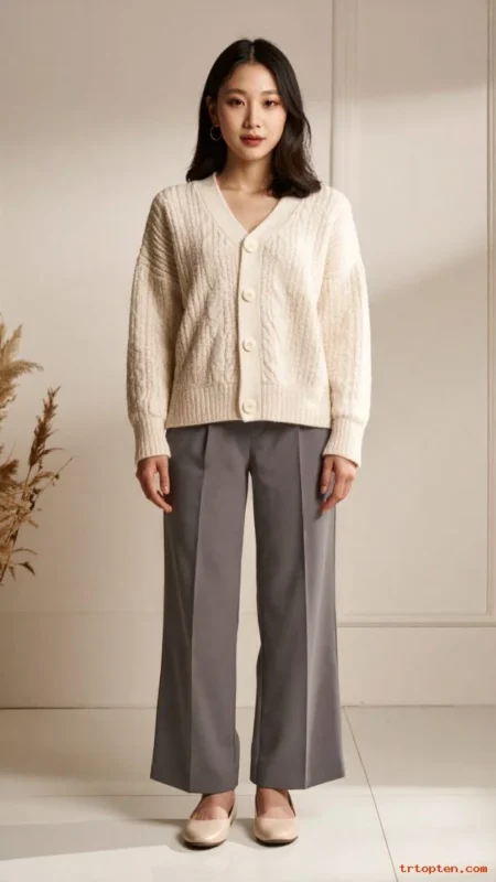 Choose a fitted cardigan with a matching shell top. Stick to cream, navy, or soft blush for a timeless palette.