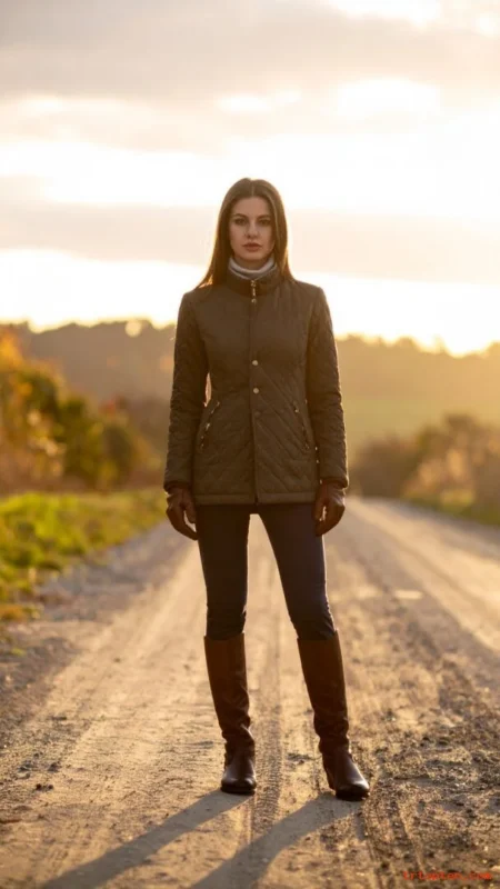 A quilted jacket gives that countryside, equestrian feel. Riding boots add structure and make the look instantly classic.