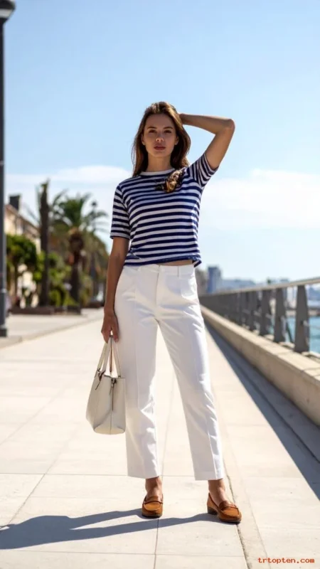 A Breton stripe top feels classic and coastal without looking costume-like. White trousers make the outfit look fresh and clean.