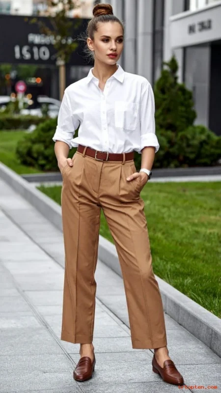A crisp button-down looks confident and expensive when it fits well. High-waist trousers lengthen the legs and add a tailored feel.