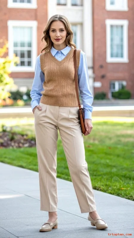 A sweater vest gives a smart, school-inspired look that still feels adult. An Oxford shirt adds crispness and structure under it.