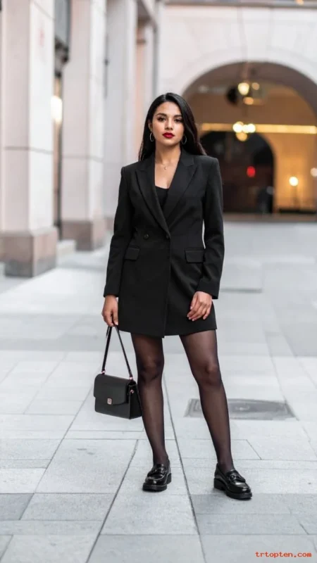 A blazer dress looks polished and powerful in one piece. Tights and loafers keep it classic and wearable.