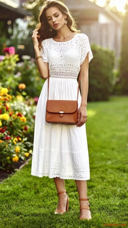 A white eyelet dress feels feminine and classic in a quiet way. Tan accessories warm the look and keep it grounded.