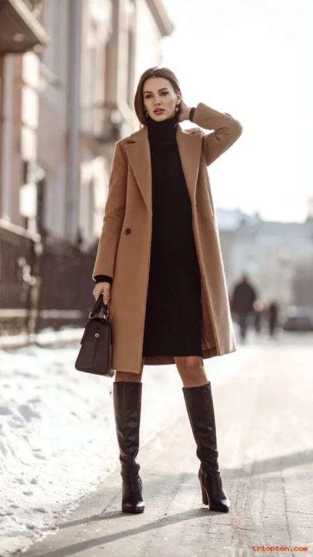 A camel coat reads classic and wealthy in a quiet way. A knit midi dress keeps the look soft but still put-together.