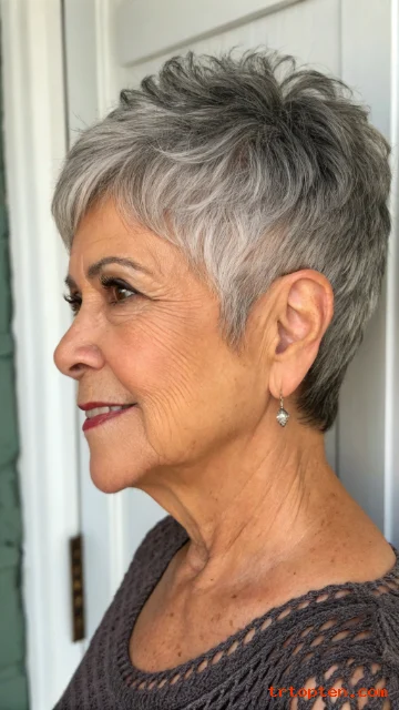 A salt-and-pepper pixie keeps natural color contrast on display. The mix of tones adds depth, so the cut looks fuller.