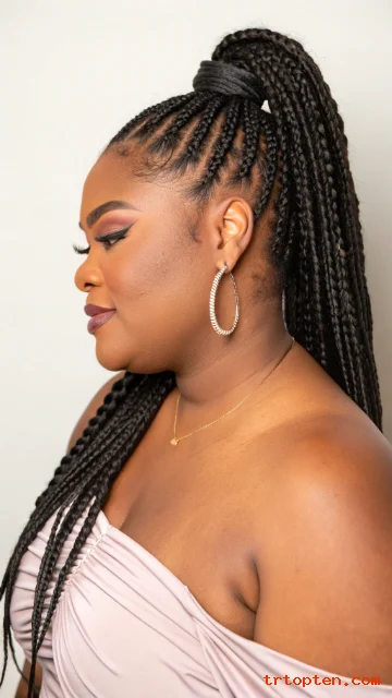 A braided ponytail is bold and practical. Knotless braids reduce tension and help the style look natural at the roots. The high placement lifts the whole look.