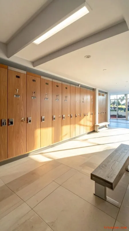 Place lockers near the entry so wet items do not travel through the whole room. This layout keeps the lounge cleaner.